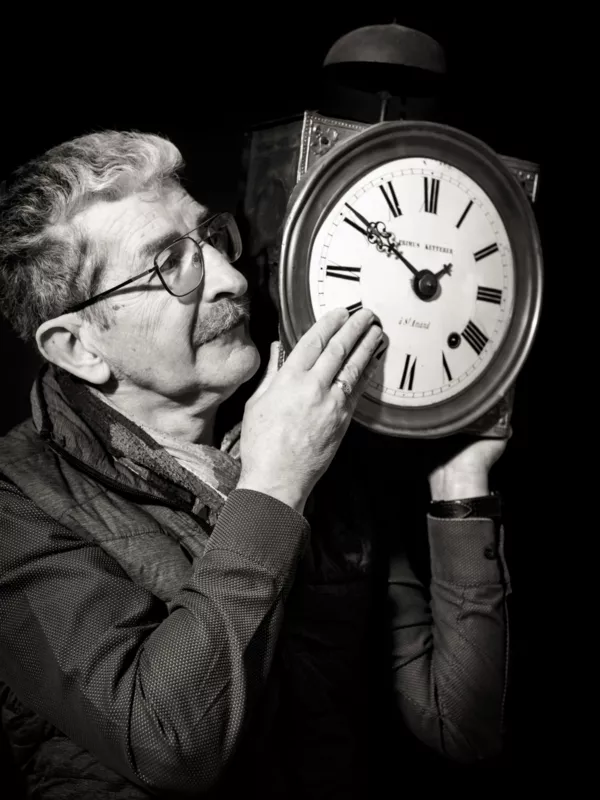 Denis assure des gestes techniques fins qui demandent une concentration intense lorsqu’il répare les horloges et les montres dans son atelier d’horloger. Il se met en pleine écoute de ses pendules et de ses montres. Cette écoute, il la soigne aussi avec ses clients avec qui il devient parfois un confident.